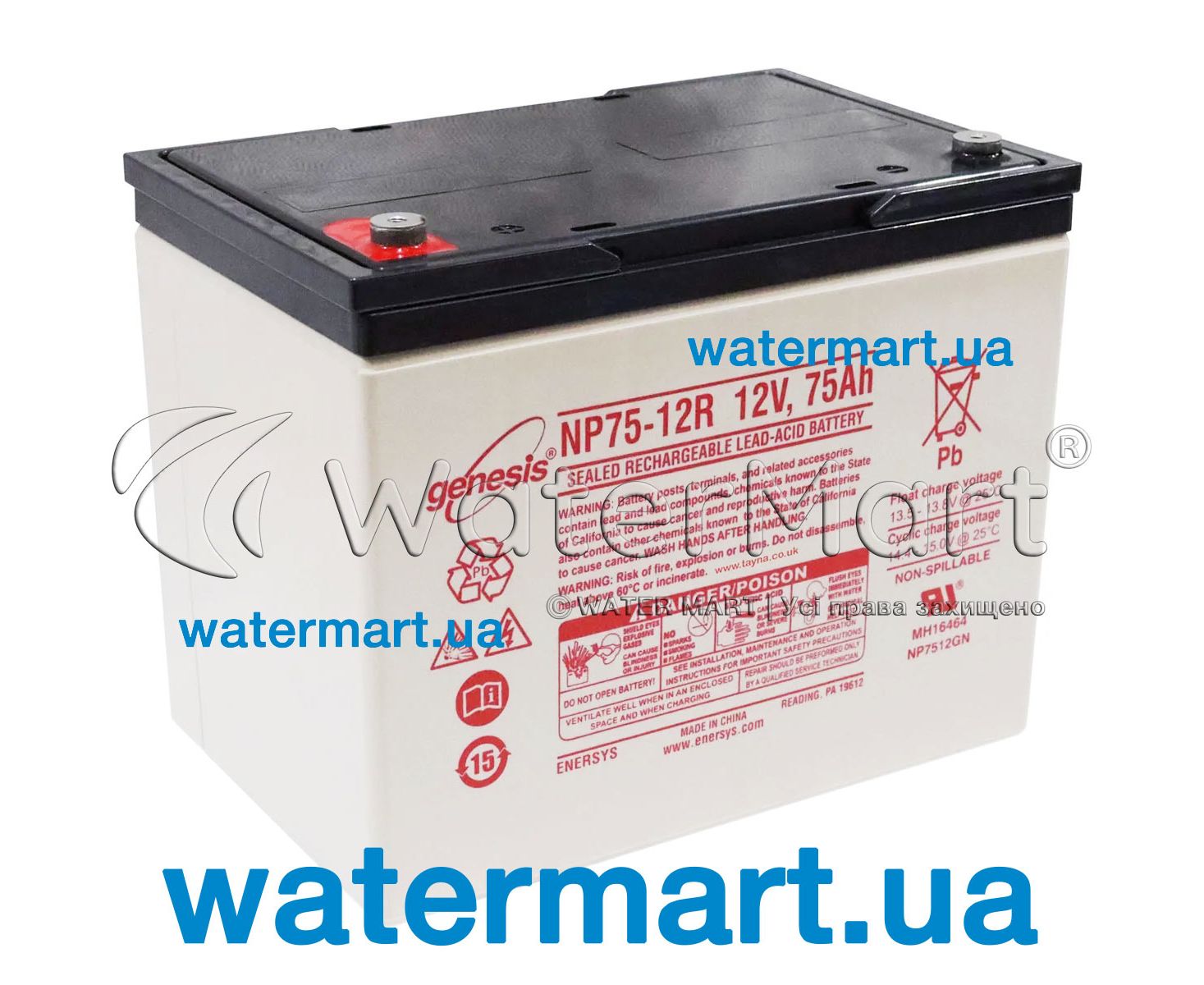 Серия свинцово-кислотных необслуживаемых аккумуляторов напряжением 12 В и номинальной емкостью 75 Ач NP75-12 EnerSys® / Genesis® NP Battery Series | 75Ah 12V. Имеет полностью герметичную конструкцию корпуса; клапанное регулирование (встроенный регулируемый клапан низкого давления); крышка и корпус выполнены из огнестойкого полимера UL94 V-0.