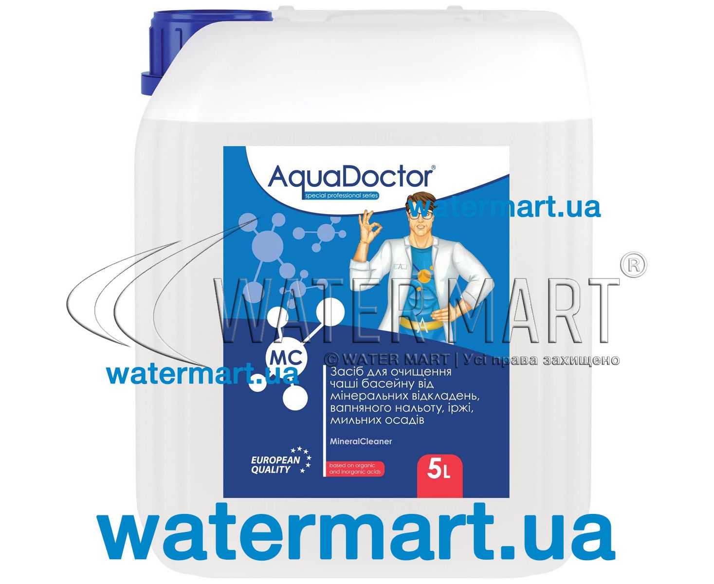 Aquadoctor MC Mineral Cleaner – универсальное дезинфицирующее средство очистки на основе органических и неорганических кислот, применяющееся для очистки поверхностей плавательных бассейнов частного или общественного назначения от известкового налета, частиц минеральных отложений и осадков, ржавчины и других органических микроэлементов, которые скапливаются на поверхности чаши бассейна. Может использоваться для ухода за любым типом облицовочного материала: мозаика, плитка, пленка, композитные и полипропиленовые чаши. Препарат не содержит фосфатов. Средство MC Mineral Cleaner следует применять в хорошо проветриваемом помещении. Перед началом использования препарат необходимо разбавить теплой водой в пропорции 1:1, после чего нанести полученный состав на загрязненную поверхность, и подождать 15-30 минут. Далее обработанную поверхность следует тщательно очистить щеткой и промыть водой. При сложных загрязнениях процедуру необходимо повторить. Ознакомиться с другими видами чистящих средств, применяющихся для очистки поверхностей плавательных бассейнов.