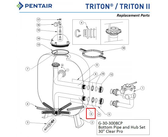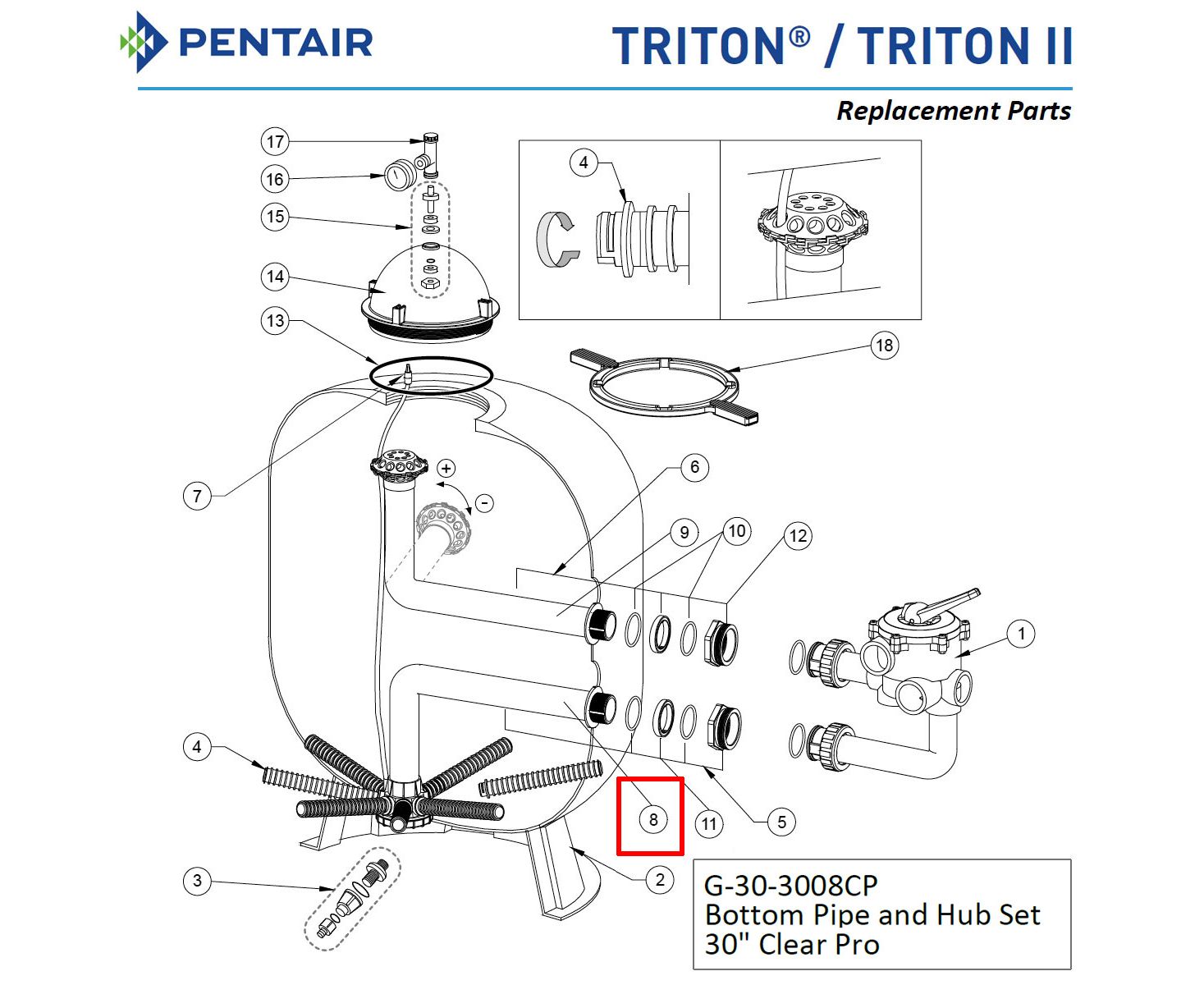 Нижний дистрибъютор в комплекте G-30-3008CP | Bottom Pipe and Hub Set 30" Clear Pro. Запчасть совместима с серией фильтров для плавательных бассейна ТМ PENTAIR Triton TR 100 / D762 mm (модель: F-30S8-TRV).
