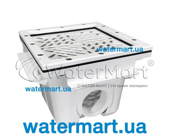 Square Main Drain with ABS grille 210 mm x 210 mm | 00273 by AstralPool – закладная из белого коррозионностойкого пластика ABS, использующаяся в качестве основного элемента для забора и подачи воды в систему фильтрации бассейна. Подходит для установки в плавательные бассейны домашнего (частного) или общественного пользования с пленочной внутренней облицовкой (ПВХ-мембрана / ПВХ-пленка / лайнер). Устройство рекомендуется монтировать в плавательную чашу с соблюдением минимального расстояния до 2 м (между несколькими донными трапами). Максимальная пропускная способность – 13 м³/ч. Донный трап изготовлен и прочного ABS-пластика белого цвета, имеющего устойчивость к температурным перепадам, воздействию прямых ультрафиолетовых лучей, агрессивной среде. Подключение – резьбовое 2". Лицевая декоративная решетка крепится к корпусу донного трапа с помощью нержавеющих винтов. В комплекте предусмотрены специальные фланцевые соединители для монтажа под пленку.