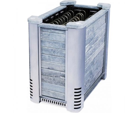 Каркас корпуса данной модели электрокаменной печи полностью изготовлен из высококачественной нержавеющей стали, которая обшита сегментами мыльного камня (кроме боковых ножек). Такое сочетание материалов весьма удачно, так как металл очень быстро нагревается и оперативно начинает отдавать тепло в атмосферу, а камень долго сохраняет тепло, что делает установку максимально энергоэффективной и безопасной для человека (соприкосновение кожных покровов с камнем не приводит к ожогам). Боковые ножки из металла способствуют повышенной механической прочности устройства и могут регулироваться по высоте. В верхней части ножек находятся каменные накладки с отверстиями для ароматических масел, которые помогают нервной системе человека расслабиться.