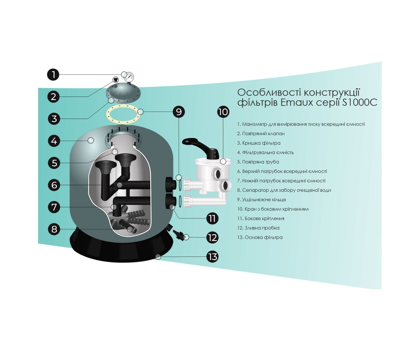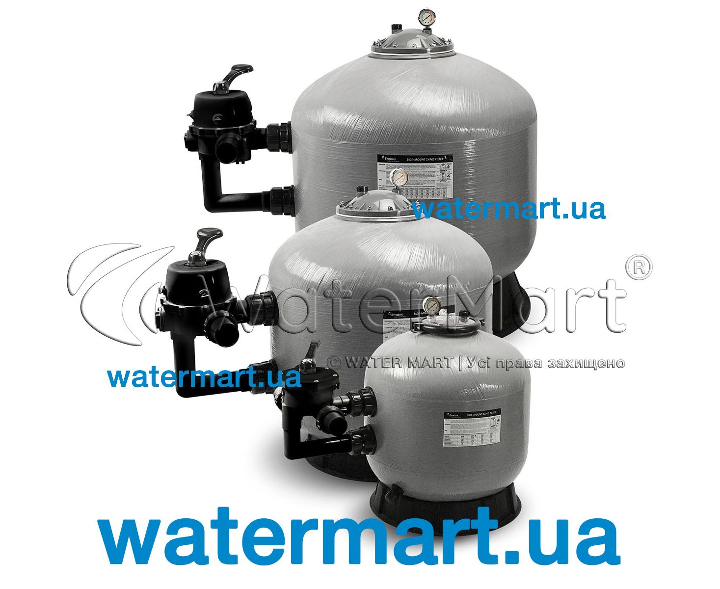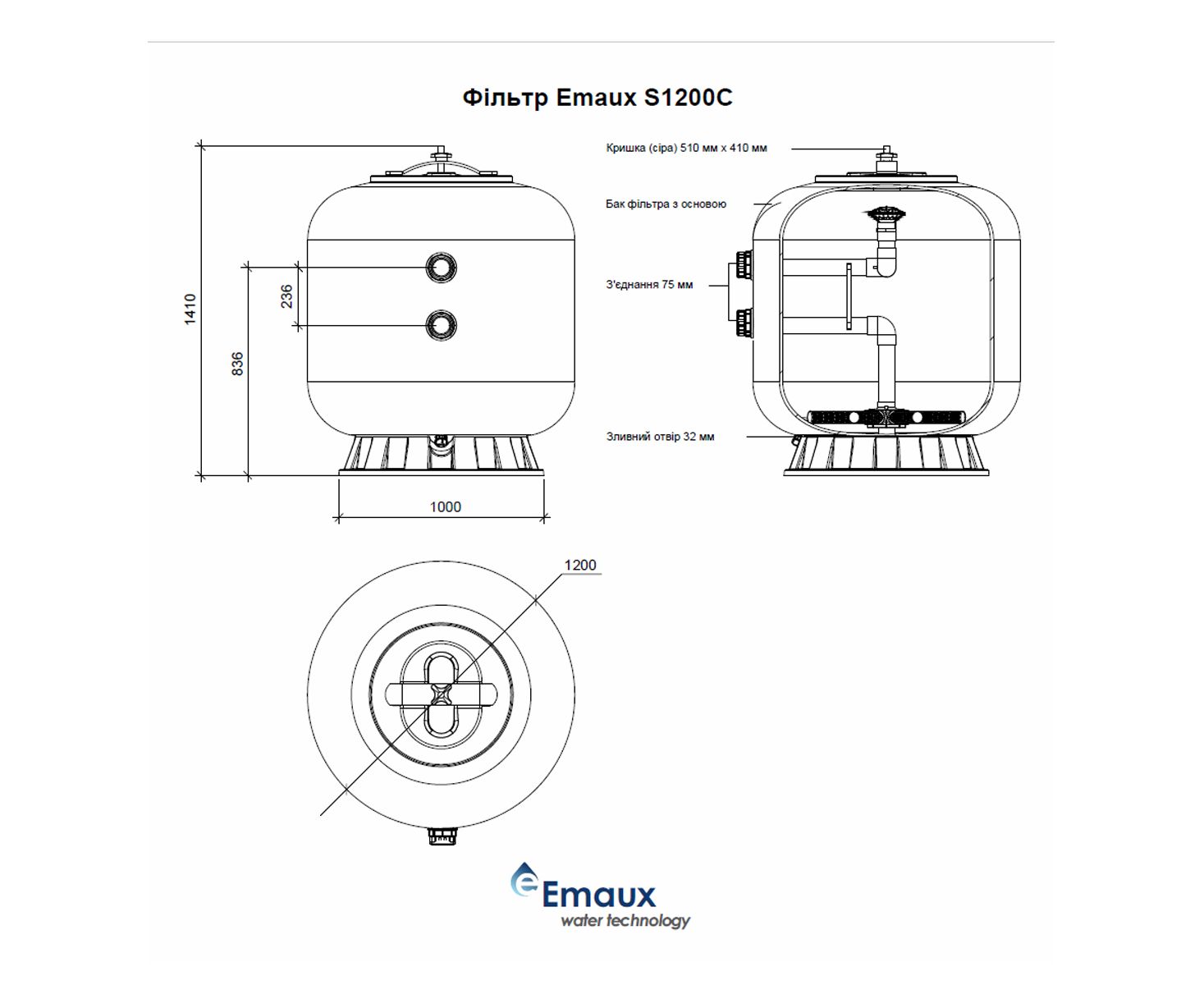 Emaux S Series Filter | For residential and semi-commercial pools | Model: S1200C | 88011352 / 9011304 | 58,5 m³/h – модель фильтровальной емкости Ø1200 мм максимальной производительностью 58,5 м³/ч с многофункциональным 6-позиционным боковым управляющим клапаном. Применяется для механической очистки воды и устанавливается в частные или коммерческие плавательные бассейны с рекомендованным объемом воды до 234 м³. Корпус фільтровальной емкости выполнен из коррозионностойкого полимера, усиленного стекловолокном (материал устойчив к воздействию УФ-лучей и температурных перепадов).