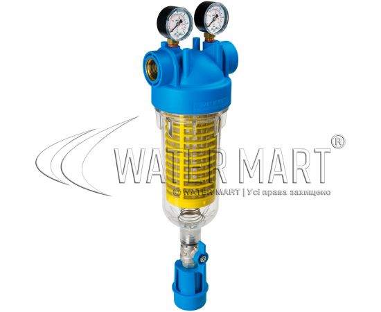 Модель самопромывного магистрального фильтра 90 mcr с двумя манометрами для очистки холодной питьевой воды. Подключение: внутренняя резьба ½". Картридж: сетка из нержавеющей стали.