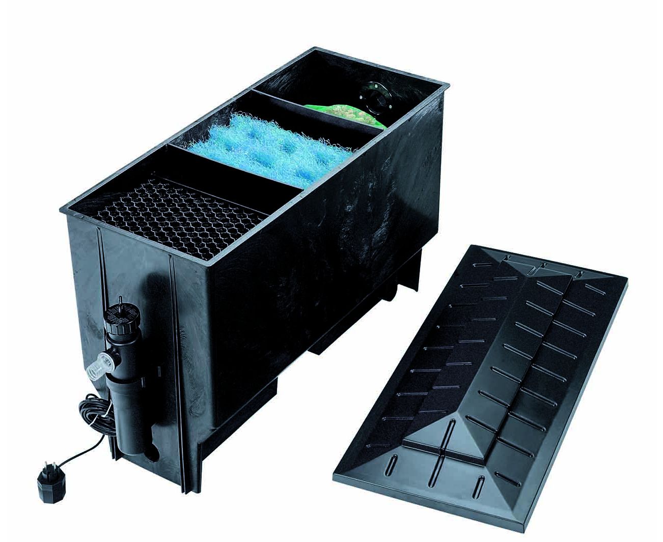 Фильтр Xclear Chamberfilter 4056613 обеспечивает комбинированную очистку прудовой воды. Он состоит из трех отдельных камер, заполненных ситами для механической очистки и фильтровальными губками для биологической очистки. Предназначен для водоемов без рыбы объемом до 20 м³ и прудов с рыбой - до 8 м³. Максимальная производительность составляет 4 м³/ч. Необходимо подключение к насосу. Фильтр оснащен ультрафиолетовой установкой с 11-ваттной лампой UV-C, которая осуществляет обеззараживание воды. Таким образом вода после фильтрации становится не только чистой, но и безопасной.