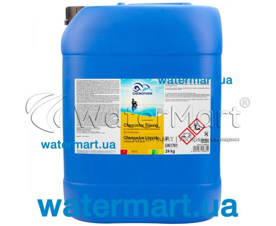 Chemoform Chemochlor 24 kg – стабилизированный жидкий хлорпрепарат (соответствует стандарту DIN 19643) с содержанием активного хлоркомпонента 13 %, применяющийся для шоковой и регулярной обработки воды в плавательных бассейнах частного или общественного пользования. Может использоваться как для автоматических дозирующих систем, так и для ручной обработки воды в бассейне. Обеспечивает эффективную очистку воды от органических частиц загрязнений (вирусы, бактерии, грибок, водоросли и другие микроорганизмы); наличие в составе препарата специального стабилизатора предотвращает образование известкового налета на поверхностях бассейна и в дозирующих устройствах.