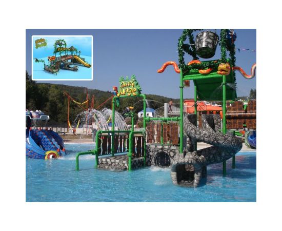 Захватывающий аттракцион для детей в виде аква-зоны «Джунгли» позволит создать захватывающую и привлекательную атмосферу для детей. Объект состоит из декоративных изделий, зоны для анимации и водных горок разных цветов и типов.