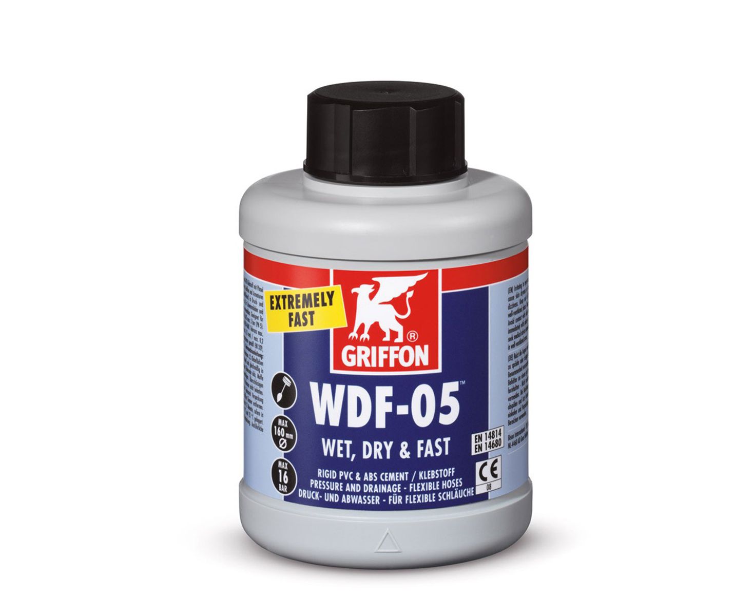 Быстросхватывающийся клей Griffon WDF-05 предназначен для соединения гибких (флекс) труб, ПВХ-фитинга и ПВХ-труб в системах дренажа и системах, находящихся под постоянным давлением.