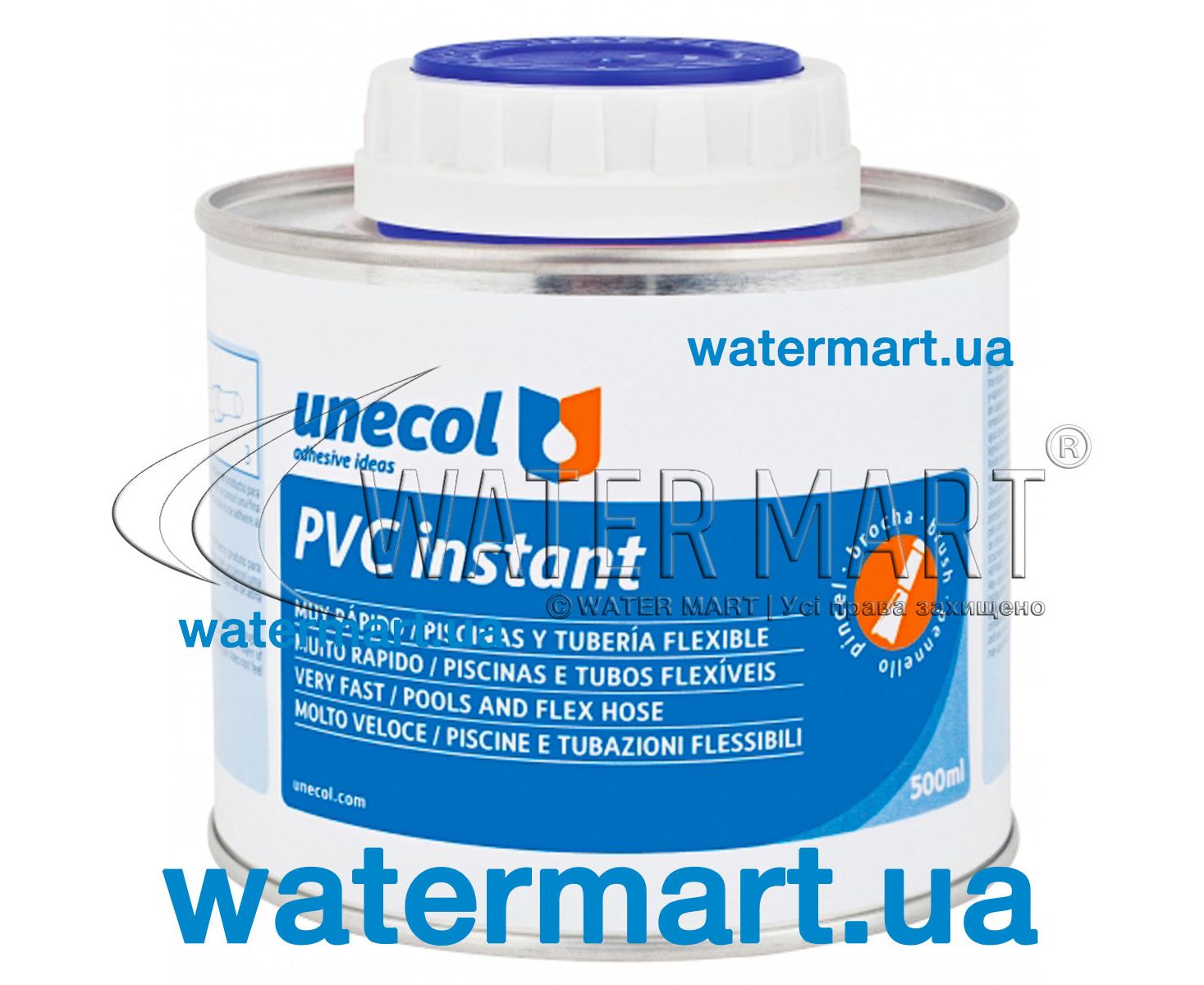 PVC Instant 500 ml (Unecol) – клеевой состав емкостью 0,5 л производства испанской компании Unecol, применяющийся для соединения трубопроводных элементов и фитинга из жесткого ПВХ в напорных системах (трубы из термопластичных материалов, использующиеся для перекачки жидкостей под давлением PN16). Сферы применения: используется в установках транспортировки / хранения воды промышленного и бытового значения; в трубах с питьевой водой; применяется при обустройстве плавательных бассейнов (трубопроводная обвязка); системах водоснабжения, орошения, газовых и промышленных установках. Описание: имеет гелевую консистенцию, высокий показатель тиксотропии (индекс тиксотропии – 5), быстро схватывается, не растекается, температура эксплуатации: от –5 до +50 °C, полное время высыхания – 24 часа. Условия хранения клеевого состава Unecol Instant – для сохранения исходных свойств клея, продукт следует хранить в оригинальной упаковке в прохладном и сухом месте, вдали от огня и других источников тепла (не рекомендуется хранить клей при температуре ниже 5 °C).