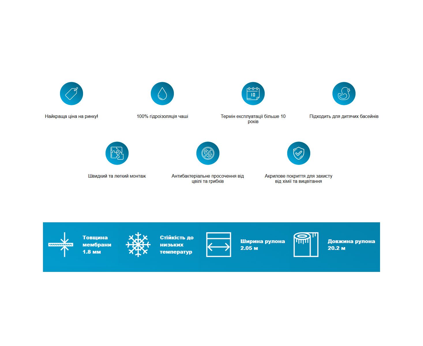 Aquaviva Textured Liner / PVC-Membrane for Swimming Pool 2.05 m / 41.41 m² | Touch Diorite Granite – серия гидроизоляционно-облицовочного пленочного покрытия толщиной 1,8 мм с внешним текстурным покрытием в виде «камня», использующаяся для внутренней облицовки плавательных бассейнов. Внешнее защитное лакированное покрытие препятствует воздействию внешней агрессивной среды (пленка устойчива к воздействию УФ-излучения, препаратов и средств, использующихся для обработки воды в бассейне). Специальная внутренняя противобактериальная пропитка препятствует образованию на поверхности лайнера грибка, плесени, водорослей и других микроорганизмов.