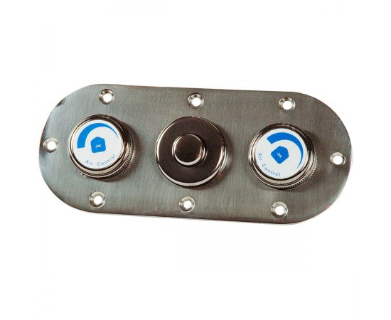 Пневматическая панель управления гидромассажным аттракционом изготовлена из кислотостойкой нержавеющей стали (AISI-316), оснащена двумя пневморегуляторами подачи воздуха в форсунки и кнопкой запуска. Для монтажа в борт бассейна необходим закладной элемент FitStar 8701050.