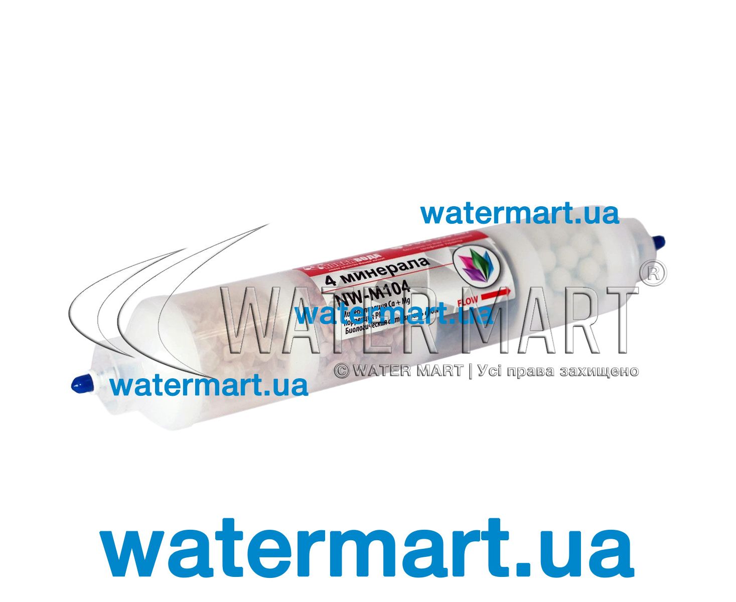 NW-M104 Ca + Mg – линейный минерализатор картриджного типа стандарта 2" х 10", применяющийся в обратноосмотических устройствах очистки питьевой воды, устанавливающихся в бытовых и коммерческих водоочистных системах. Сменный модуль содержит сбалансированный состав природных минеральных пород: основные минералы – кальцит, турмалин, обожженная биоактивная гранулированная керамика; дополнительные компоненты – калий, кальций, магний, натрий и др. (всего более 20 полезных микроэлементов). Контактируя с каждым из структурных элементов картриджа, вода обогащается полезными минеральными веществами и приобретает свойства биологически активной. Рабочее давление – до 6 атмосфер. Температура – от +2 до +35 °C. Подключение – ¼" (Quick connect).