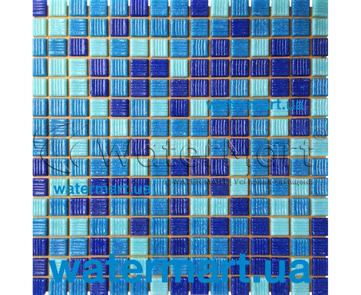 Серия матовой стеклянной мозаики 20 х 20 х 4 мм Aquaviva Majorca Dark для облицовки бассейнов. Цвет: синий, светло-синий, голубой. Основа: бумага. Лист: 327 x 327 мм. Упаковка: 20 листов / 2,14 м².