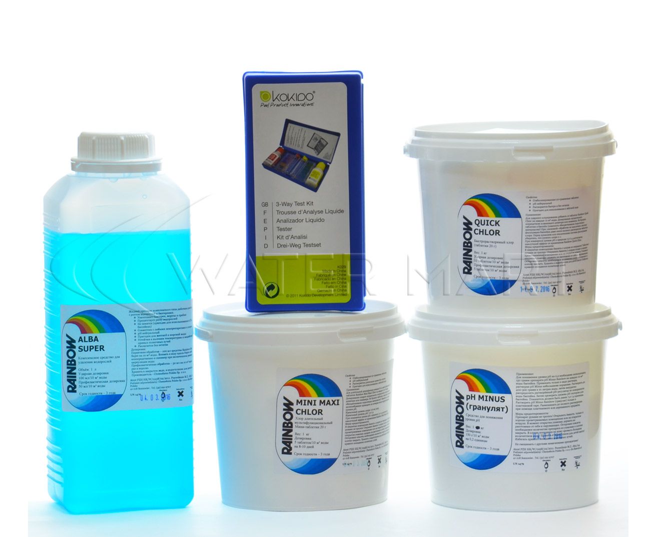 Rainbow Mini - комплект химии для обслуживания небольшого (каркасного, сборного или стационарного) бассейна. В зависимости от качества исходной воды, данного набора хватает на срок до трех месяцев.
