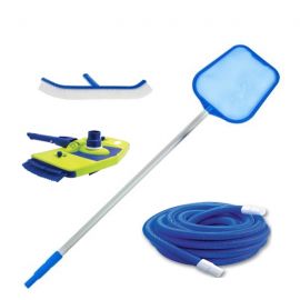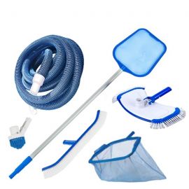 Набор для уборки бассейна состоит из щетки, шланга и телескопической штанги. Плавающий шланг одним концом подключается к системе фильтрации бассейна (скиммеру или всасывающей форсунке), а другой - к щетке. За счет этого поток воды, создаваемый циркуляционным насосом, затягивается через щетку и позволяет удалять с поверхности бассейна загрязнения. На каждой щетке предусмотрены крепления для телескопической штанги. Длину штанги и шланга следует выбирать исходя из размеров вашего бассейна. Например, для бассейна размером 6 х 3 м. и глубиной 1.5 м достаточно стандартной телескопической штанги, длина которой в сложенном состоянии составляет 1.8 м, а в разложенном - 3.6 м. и шланга длиной 9 м.п.