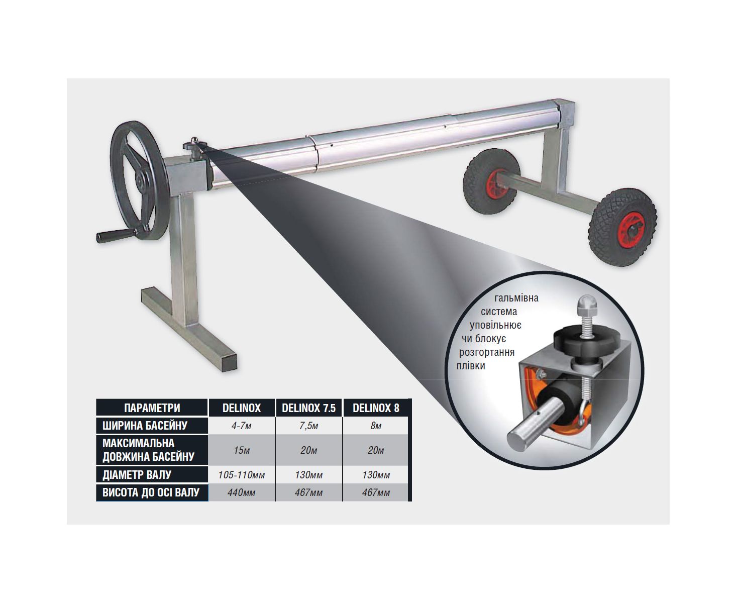 Усиленное наматывающее устройство производства Франции, предназначенное для наматывания и хранения солярной теплосберегающей пленки для больших плавательных бассейнов DEL W-ENPT03100 7,5 x 20 m | MANUAL REEL SYSTEMS DELINOX Max.