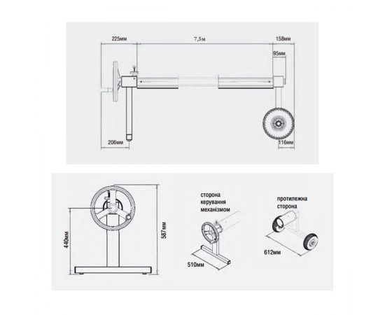- Управление осуществляется при помощи специального колеса (Ø 300 мм) с ручкой для сматывания, а также ременной тормозной системы