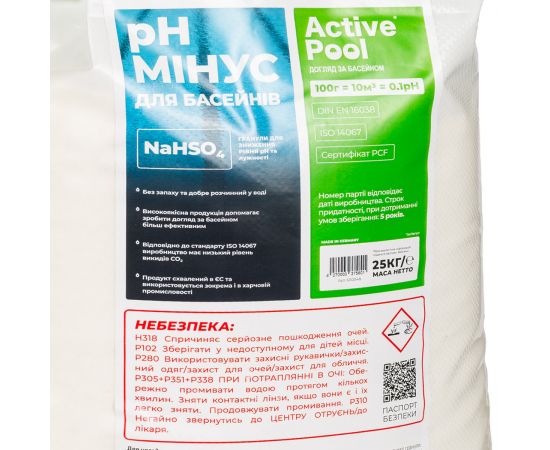 Высококачественное гранулированное средство на основе 100%-ного неорганического бисульфата натрия pH Minus Active Pool DIN EN 16038 600048 для снижения водородного показателя pH в воде плавательного бассейна. Вес: 25 кг.