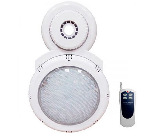 Навесной прожектор не уступает по производительности встраиваемым моделям – 180 цветных LED-элементов потребляю 15 Вт электроэнергии, при этом выдают мощный световой поток. Для удобства пользования прожектором в комплект поставки входит пульт дистанционного управления, который снабжен кнопками переключения шестнадцати световых режимов (11 статических и 5 динамических). Перед эксплуатацией пульт и прожектор необходимо синхронизировать.