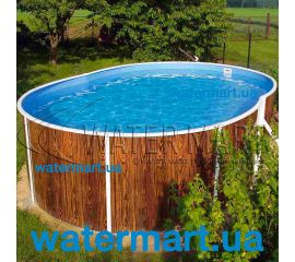 Овальный каркасный бассейн серии Azuro Wood VARIO 407 DL. Длина: 9,1 м. Глубина: 1,2 м. Цена включает стальной каркас, лайнер Pebbels, оборудование фильтрации, скиммер. Лестница приобретается отдельно.