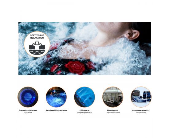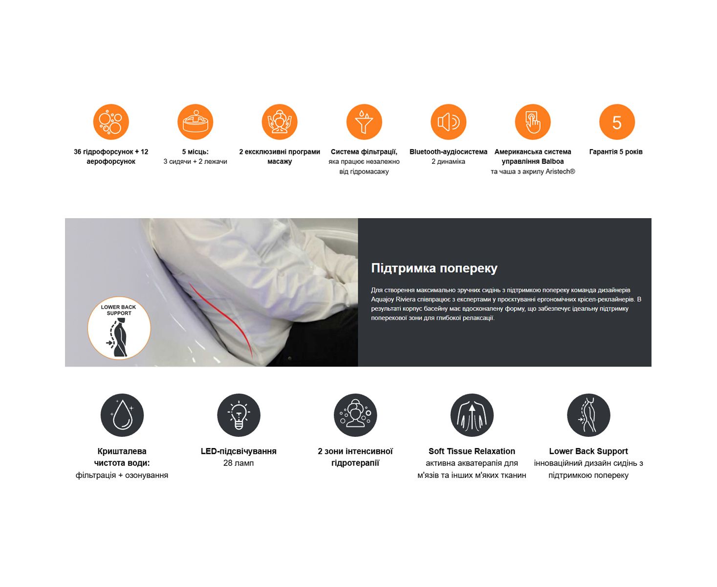 - Количество форсунок – всего 52 шт. (36 гидротерапевтических, 4 циркуляционных и 12 аэрофорсунок)