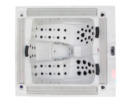Hydromassage SPA-pool Aquajoy Marmaris Silver White Marble | AJ-4804SW. Гидромассажный переливной СПА-бассейн на 3 места (1 кресло / 2 лежака) размером 230 x 198 x 89 см. Объем: 1100 л. Количество форсунок: 67 шт. (53 гидротерапевтические, 6 циркуляционных и 8 аэрофорсунок). Чаша: акрил Aristech® Acrylic, цвет: «серебристо-белый мрамор». Панель управления и система контроля: Balboa Systems.