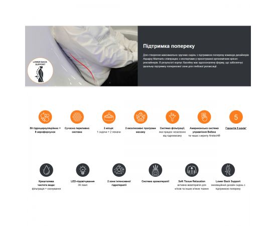 • Массажные зоны – 2 зоны интенсивной гидротерапии; специально предусмотрены эргономичные места с поддержкой массажа поясничной зоны