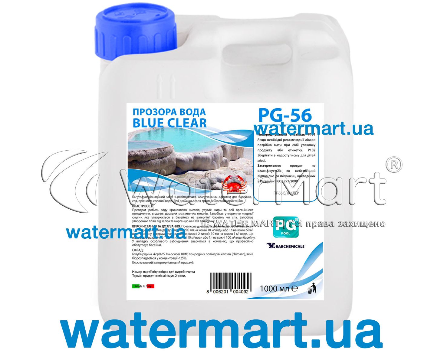 Blue Clear LIQUID PG-56 | by Barchemicals (Italy) | 1L – специальное многофункциональное средство с осветляющим и коагулирующим эффектом, применяющееся для регулярной обработки воды в гидромассажных СПА-бассейнах, СПА-ваннах, джакузи и других видах SPA (плавательные чаши с пресной / соленой / термальной водой).