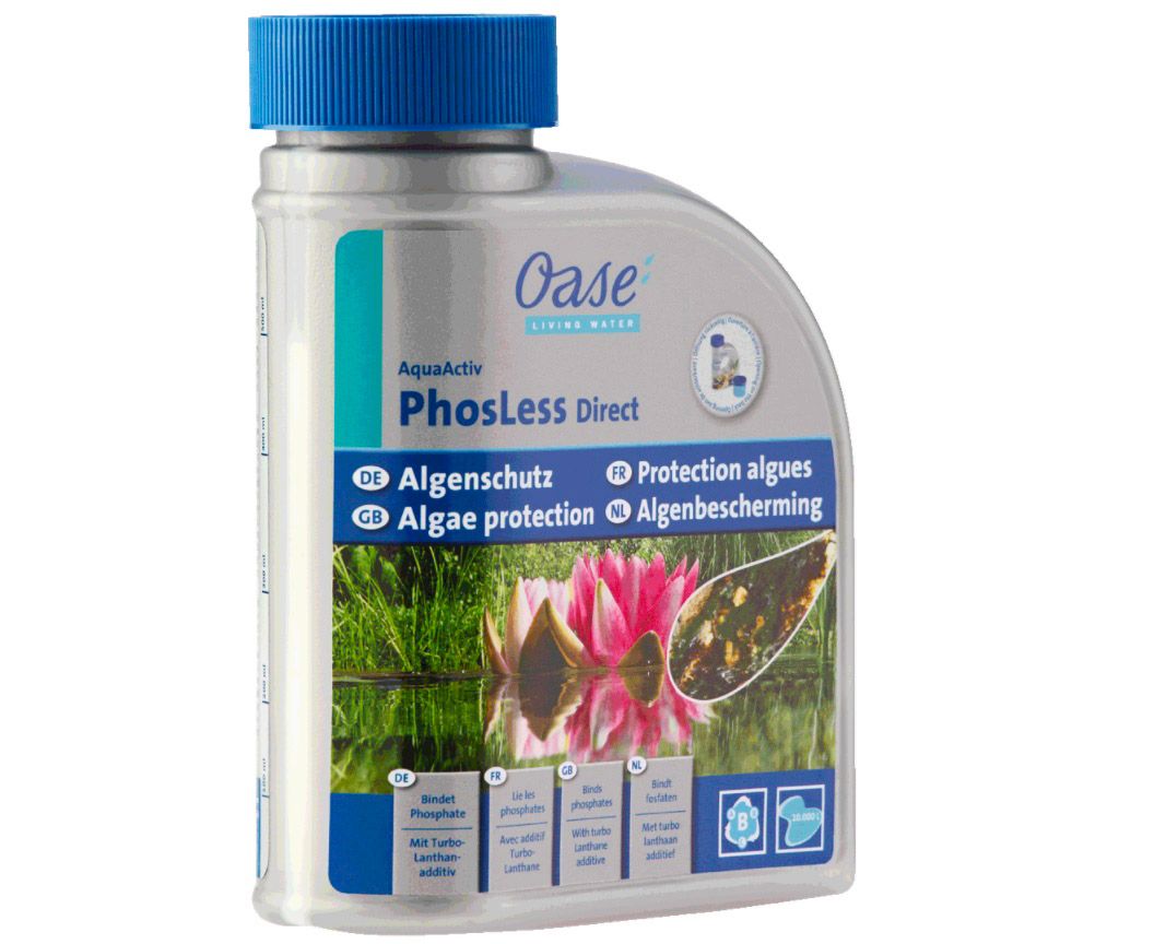 Oase PhosLess Direct 51284 - эффективный и быстрый способ снижения уровня фосфатов в прудовой воде. Фосфаты являются питательными веществами для водорослей, поэтому уменьшение их количества приводит к подавлению роста и развития всех типов водорослей. Увеличение фосфатов в воде может происходить после обильных ливней и при разложении остатков корма для рыб.
