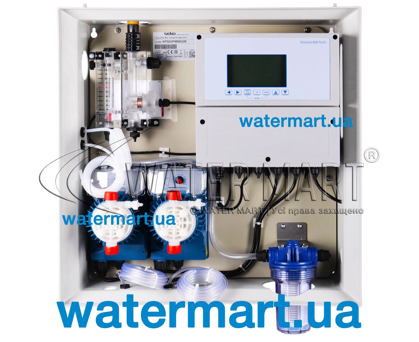 Seko Kontrol Guard Fort (KPS02PM85G00) – автоматическая система в комплекте с многопараметрическим контроллером и двумя дозирующими мембранными насосами, устанавливающаяся в коммерческие плавательные бассейны с повышенной нагрузкой объемом до 500 м³ в качестве дополнительного оборудования для контроля, измерения и поддержания заданных параметров водородного показателя pH и свободного хлора FCl.