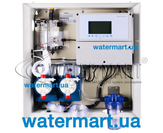 Комплектуется основной монтажной панелью (блоком); двумя проточными ячейками с установленными контрольными датчиками pH/Cl; двумя насосами-дозаторами Tekna; датчиком температуры; набором калибровочных растворов; крепежными элементами (кронштейн для настенной установки, два штуцера, трубкой для подвода жидкости, руководством пользователя). Устройство в автоматическом режиме производит контрольные замеры химических параметров воды в бассейне, регулирует уровень содержания pH/Cl, выполняет контроль потока воды и измерение температуры (в диапазоне от 0 до 105 °C). Станция подходит для обслуживания бассейнов с морской водой. Электропитание – 240 В / 50 Гц. Производительность – 5 л/ч.
