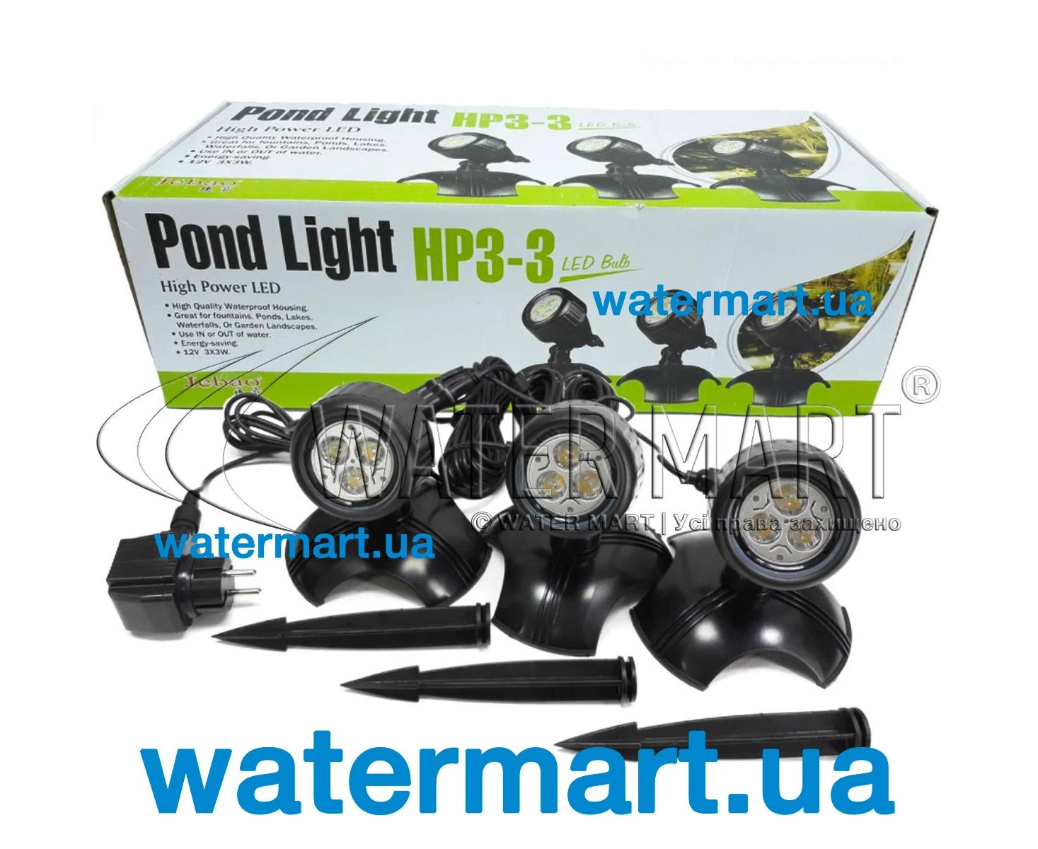 Светильники для пруда Jebao HP3-3 – комплект из трех LED-подсветок для декоративных прудов, водоемов и фонтанов. Могут служить для освещения объектов в воде, элементов декора и ландшафта, и создают приятную атмосферу в вечернее время. Набор состоит из трех светильников с энергосберегающими белыми светодиодами. Мощность прожекторов 3 Вт каждый. Их установка возможна как на берегу водоема, так и в самой воде, на глубине до 1 м (трансформатор должен быть установлен над водой). Корпус светильника изготовлен из прочного пластика, устойчивого к воздействию внешней среды. Длина кабеля составляет 2 м (от вилки до тройника) + 5 м (от тройника до прожектора).