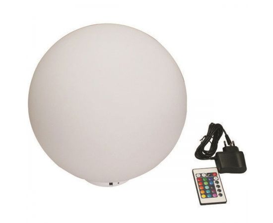 Данная модель прожектора предлагается в форме шара, внутри которого находится 16 RGB-ламп, которые могут менять цвета согласно четырем встроенным программам. Имеется возможность задать уровень яркости освещения при помощи пульта удаленного управления, который поставляется вместе с осветителем. Радиус действия пульта составляет 3 м. Прожектор может быть активен от 5 до 15 часов, после чего потребуется шестичасовая подзарядка. Это означает, что устройство работает по беспроводной технологии электропитания – прожектор стоит на модуле с вшитым аккумулятором, который питает диоды. Такой способ энергообеспечения позволяет отказаться от проводов напряжения и присвоить прожектору класс изоляции IP 65. Корпус прожектора изготовлен из прочного пластика с пониженным содержанием углерода, который не подвержен влиянию коррозии и потемнению при длительном нахождении на открытом воздухе.