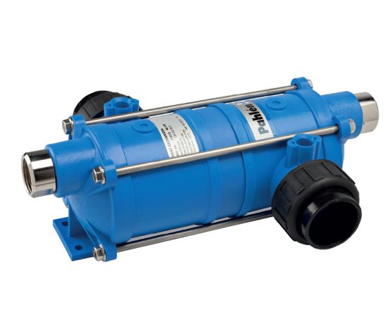 Спиральный теплообменник для нагрева воды бассейна Pahlen HI-Temp HT 75 с корпусом из армированного термостойкого пластика, спираль теплового контура выполнена из качественной кислотостойкой нержавеющей стали AISI 316L. Подходит для использования в бассейнах с электролизными установками. Повышенная стойкость к агрессивной среде. Длительный срок эксплуатации. Максимальное давление: вторичный контур (вода бассейна) - 4 бар, первичный контур (отопительный контур) - 5 бар. Поток, л/мин.: вторичный контур (вода бассейна) - 300, первичный контур (отопительный контур) - 43. Гидравлическое сопротивление Н, м: вторичный контур (вода бассейна) - 1,7, первичный контур (отопительный контур) - 6. Преимущества: наличие встроенных в корпус крепежных элементов для удобного монтажа теплообменника на стену; накидные гайки с муфтами для клеевого присоединения к стандартному ПВХ трубопроводу 50 мм; встроенные в корпус внутренние резьбы 1" из нержавеющей стали для прямого присоединения теплообменника к тепловому контуру.
