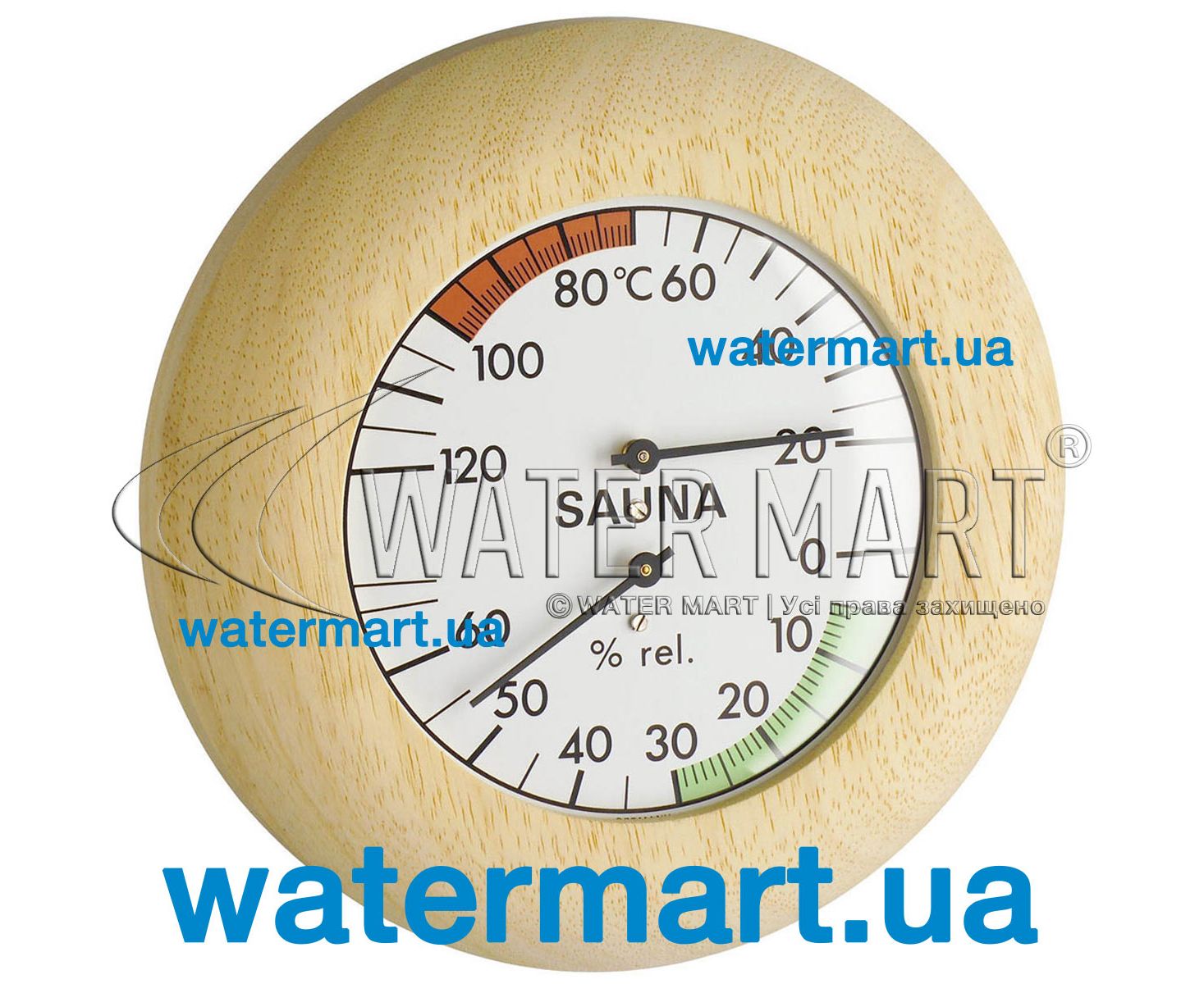 MYSPA 00031 Thermo-Hygrometer (H) 136 x (W) 42 x (L) 136 mm – универсальный аналоговый термогигрометр с корпусом из термостойкого массива дерева диаметром 136 мм, применяющийся для измерения температуры и уровня влажности в саунах. Тип установки – настенный (с тыльной стороны устройства расположено отверстие для настенного крепления). Имеет двухзонную измерительную шкалу: верхняя часть – определение температурного режима внутри помещения сауны; нижняя – измерение диапазона влажности. Выполнен из термостойких и влагостойких материалов. Размеры термогигрометра – диаметр: 13,6 см; глубина – 4,2 см.