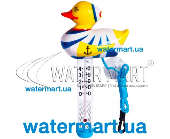 Серия термометров Mr Duck торговой марки Kokido, модель: TM08CB/18 «Моряк» – термометр спиртового типа в виде игрушки Mr Duck «Моряк», применяющийся в качестве дополнительного аксессуара для определения температуры воды в частных (домашних) или общественных плавательных бассейнах. Также подходит для использования в СПА-ваннах, СПА-бассейнах или джакузи. Корпус термометра имеет удобную для считывания показателей шкалу значений температуры воды в градусах Цельсия. Диапазон показателей температуры – от 0 до +40 °C. Выполнен из высокопрочного литьевого пластика и отдельных резиновых элементов. Материалы изготовления не содержат фталатов и других вредных химических соединений. Для удобного крепления термометр комплектуется фиксирующим нейлоновым шнуром и присоской (модель можно прикрепить к скиммеру или лестнице).