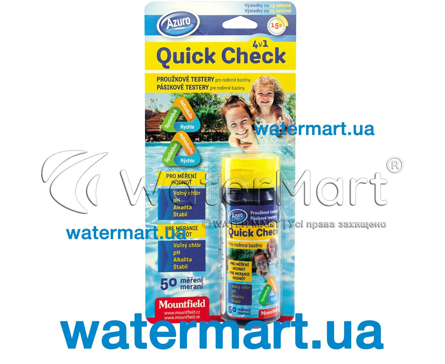 STRIP-TESTERS for Swimming Pools |Mountfield 3EXX0604 4 in 1 – набор тестовых полосок («стрип-тестер») Azuro / Mountfield Quick Check 4 в 1 для мгновенного определения основных химических параметров воды в плавательных бассейнах домашнего (частного) или общественного пользования.
