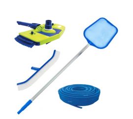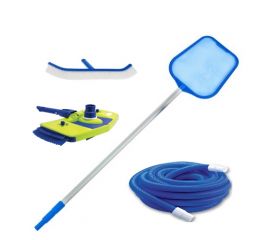 В комплект входить: вакуумна щітка з боковим ворсом, щітка для стін, щітка для кутів, телескопічна штанга довжиною 2,4-4,8 м, сачок, сачок для глибини, шланг діаметром 38 мм довжиною 15 м.п.