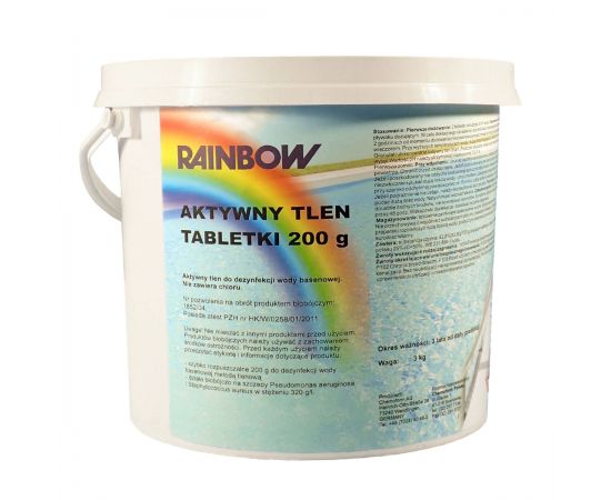 Активний кисень Rainbow O2 – препарат, за допомогою якого здійснюється дезінфекція води в громадських або домашніх басейнах. Речовина не містить хлору, тому після його використання вода в басейні не матиме неприємного запаху і не викликає подразнення шкіри. Дезінфекція такою речовиною здійснюється за допомогою дозуючих капсул або скімера.