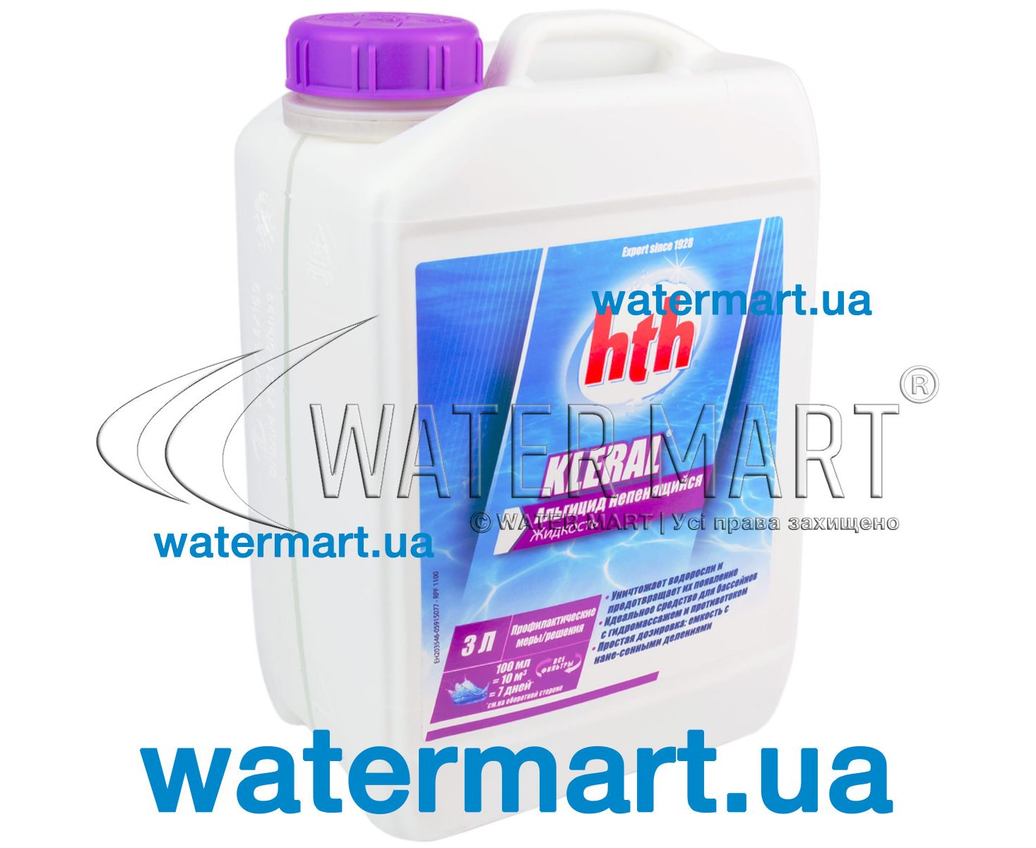 HTH Kleral® Algaecides 3L – непінний альгіцидний препарат на основі полімеризованих сполук амонію, що забезпечує захист від утворення та запобігання появі водоростей у воді плавальних басейнів приватного та комерційного користування. Не містить фосфатів та сульфату міді; підходить для застосування з будь-якими видами фільтруючих установок; не впливає на рівень водневого показника pH; після застосування не утворює піни у басейні. Дозування. При первинному застосуванні (запуск басейну) засіб Kleral додається у воду басейну виходячи з пропорції 500 мл на 25 м³ води при включеній системі фільтрації. Наступна обробка води здійснюється 1 раз на тиждень із розрахунку 250 мл засобу на 25 м³ води. Для очищення та усунення ефекту зеленої води препарат додається в пропорції 1 літр на 25 м³ води. При сильному забрудненні водоростями рекомендується одночасно провести шокову обробку води, використовуючи швидкорозчинний хлорний препарат.