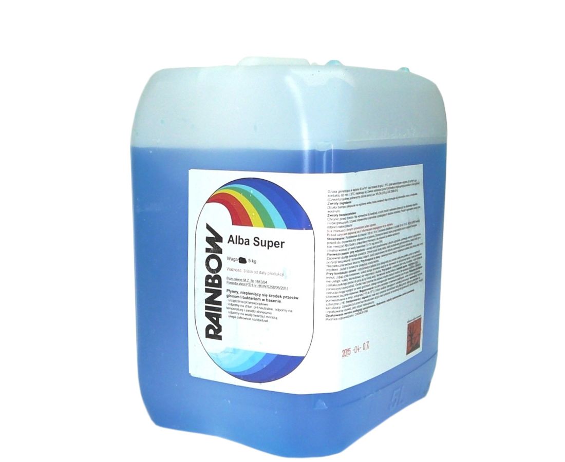 Для більш якісного захисту від росту водоростей на поверхнях басейну необхідно ретельно обробити 1% водним розчином Rainbow Alba Super всі поверхні, стики та кути басейну, потім дати висохнути.