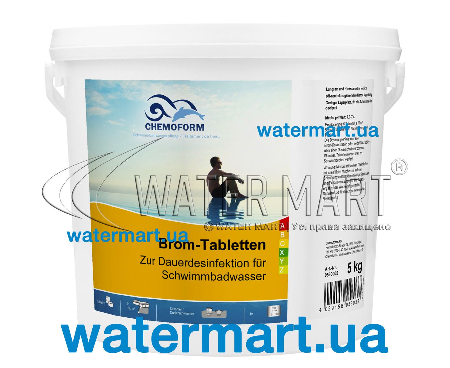 Chemoform Brom-Tabletten Chemobrom - дезінфектант на основі активного брому у вигляді 20-грамових таблеток, що повільно розчиняються, використовується для постійної дезінфекції води в плавальних басейнах приватного і комерційного призначення, гідромасажних СПА-басейнах (джакузі). Розчиняється повільно та без залишку. Водневий показник (pH) – нейтральний продукт може зберігатися довгий час. Основні переваги перед хлором: засіб застосовується незалежно від рівня рН; не має вираженого неприємного запаху і надає більш інтенсивний вплив на мікроорганізми, що утворюються у воді басейну, ніж хлор; підходить для використання у воді з будь-яким рівнем жорсткості. Ідеальне значення pH – 7,0-7,6. Рекомендований рівень концентрації брому у воді басейну – 2-3 мг/дм³. Застосування та дозування. При первинній обробці використовується 6 таблеток Chemoform Brom-Tabletten на 10 м³ води в басейні. Постійна обробка води у басейні: 2-4 таблетки на 10 м³ води. Для дозування препарату рекомендується використовувати плаваючий дозатор або скімер. Важливо! Не використовувати разом з препаратами, що містять хлор. Не кидати таблетки безпосередньо в басейн (можливе знебарвлення облицювального матеріалу).