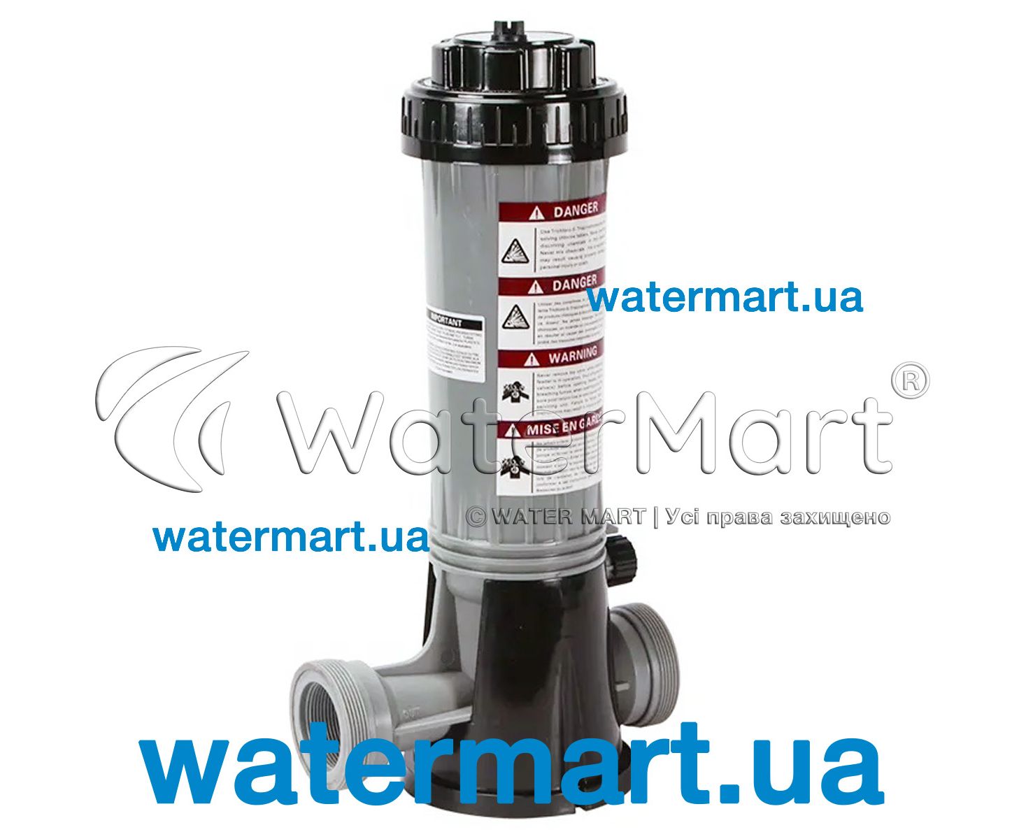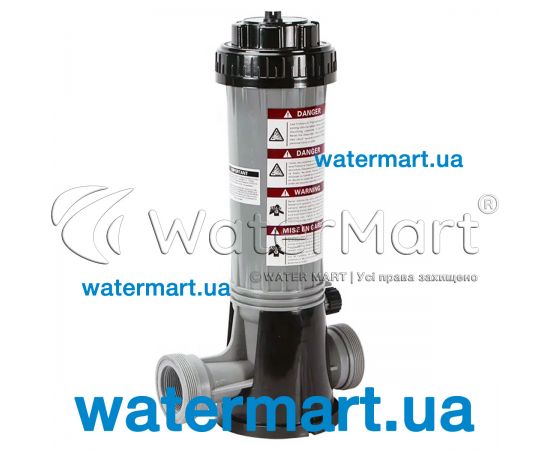 Automatic Chlorine Dispenser for Swimming Pool | Bridge PCF01B – модель напівавтоматичного дозатора, що використовується як додаткове обладнання для подачі та дозування хлорвмісних препаратів та речовин у напівавтоматичному режимі у плавальних басейнах приватного або комерційного призначення. Пристрій приєднується до системи фільтрації (вихід) і циркуляційного насоса (вхід) за допомогою запчастин, що входять до комплекту поставки: з'єднувальних штуцерів, затискачів, спеціальної трубки і тефлонової нитки (використовується для фіксації різьбових з'єднань). Складається з основного пластикового блок-корпусу, у який поміщаються хімічні реагенти у вигляді швидкорозчинного таблетованого хлору загальною вагою до 1,9 кг. Зовні пластикової ємності розташований спеціальний механічний клапан-регулятор, що забезпечує (шляхом обертання) подачу необхідної кількості хлор реагенту для дезінфекції води в басейні. Тип підключення – режим OffLine (внутрішня різьба 1½"). Важливо! Не рекомендується використовувати таблетки хлору тривалої дії; не змішувати хімічні речовини різного типу.