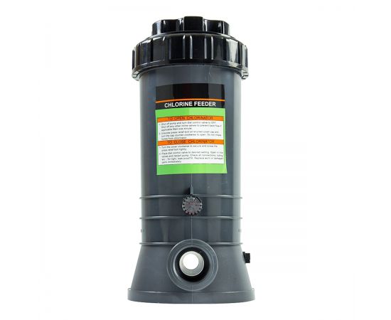 Дозатор хлору Tebas виготовлений із ABS-пластику. Приблизна ємність: 3 кг пігулок. Кришка закривається за допомогою системи подвійної безпеки. Просте регулювання дозування хімії. Одноразового повного завантаження хлору вистачає на тривалий термін експлуатації басейну. Встановлюється на обвідній лінії трубопроводу, що подає, після системи фільтрації, знезараження води та ін. Для басейнів об'ємом до 60 м³. Висота – 400 мм.