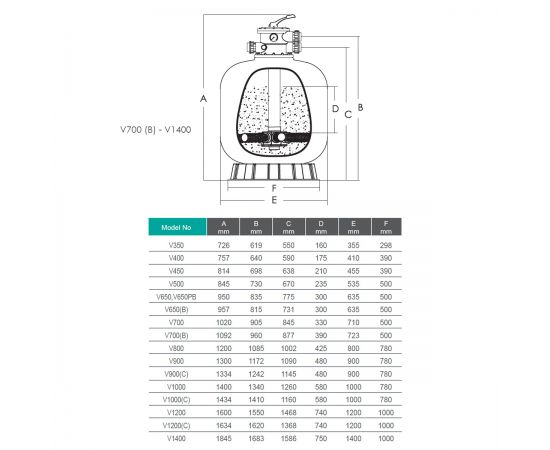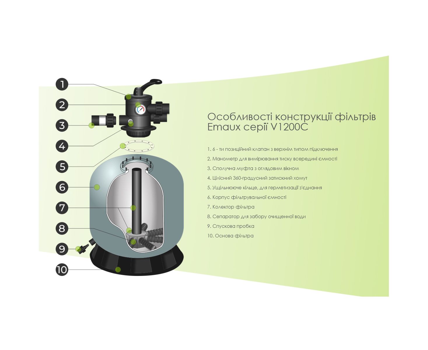 88010651 / 9010309 | 39,5 m³/h | Emaux V Series Filter | Model: V1000C | For residential and semi-commercial pools – високопродуктивний пісочний фільтр Ø 1000 mm максимальною продуктивністю 39,5 м³/год. Фільтр розрахований на роботу з робочим тиском (max) до 2,5 бар; має міцний корозійностійкий корпус, додатково посилений скловолокном.