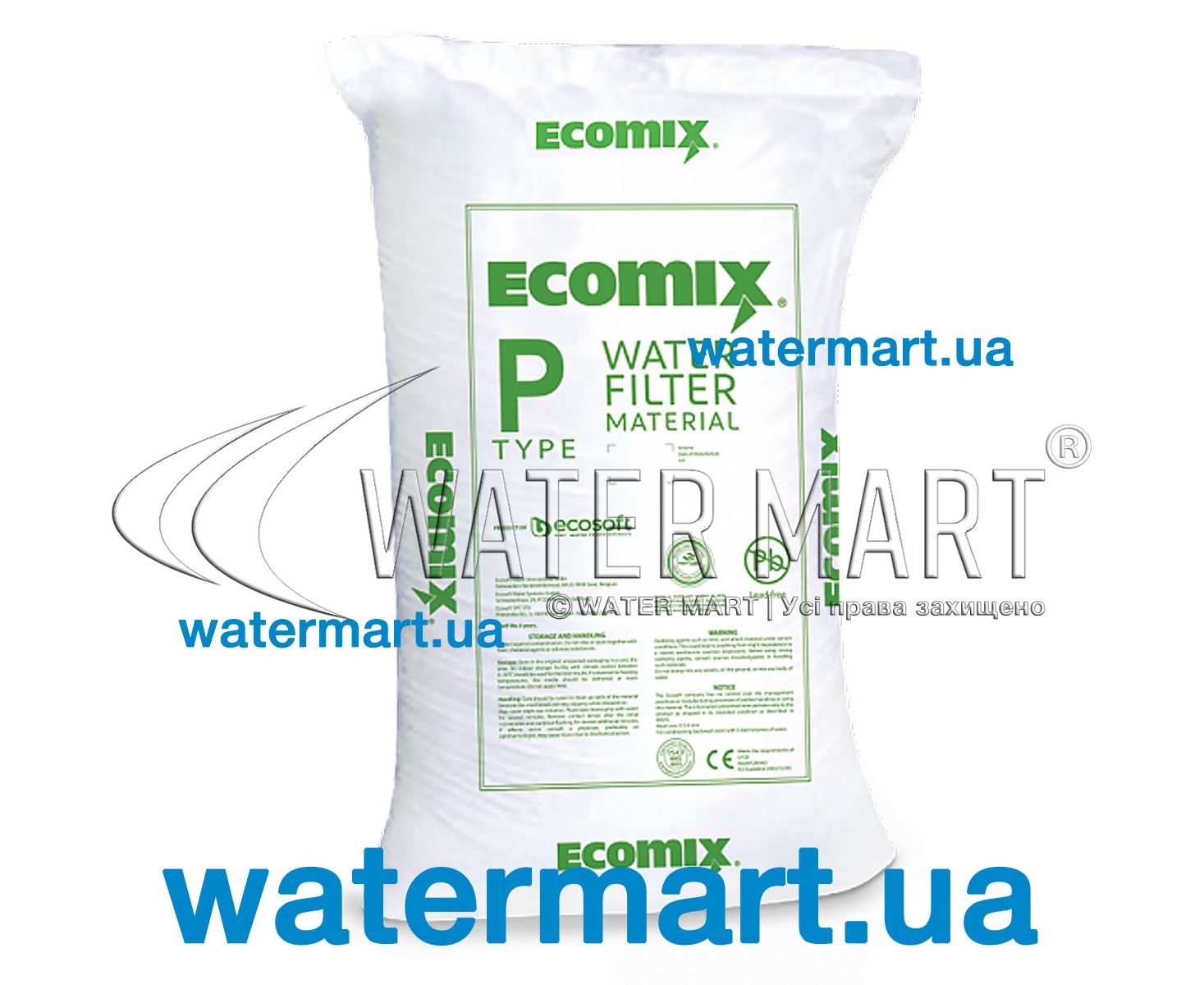 Ecosoft EcomixP25 – високоефективний фільтруючий наповнювач об'ємом 25 літрів широкого спектру дії, що застосовується як основне фільтруюче засипка в комплексних системах очищення питної води побутового та комерційного призначення. Підходить до серій фільтрувальних систем Ecosoft FK1252CEMIXA. Матеріал складається з декількох активних компонентів (включаючи сорбційні наповнювачі та катіоніт у вигляді іонообмінної смоли), що забезпечують ефективне очищення «складної» питної води від домішок заліза та марганцю, солей жорсткості та інших нерозчинних частинок. Наповнювач усуває неприємний запах і смак води, пом'якшує воду, перешкоджає утворенню накипу та нальоту в системі трубопроводу та нагрівальних елементах. У процесі регенерації використовується сольовий розчин (швидкість промивання – від 3 до 5 метрів на годину): таблетована сіль періодично регенерує фільтруючу засипку, замінюючи іони магнію і кальцію на іони натрію. Технічні параметри: швидкість фільтрації – 20-25 м/год; максимальна витрата води при зворотному промиванні – до 10 літрів на 1 літр наповнювача; швидкість зворотного промивання – 10-15 м/год; рекомендована висота шару – 800 мм; висота (min) – 500 мм; витрата солі – 100 грамів на 1 літр засипки; робоча температура (max) – 40 °C.