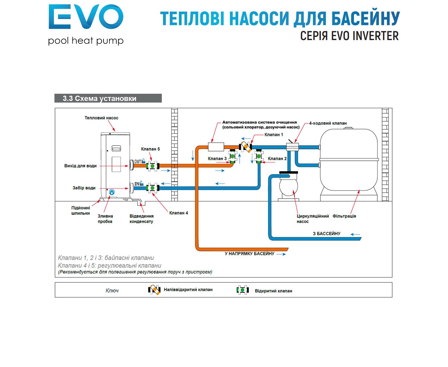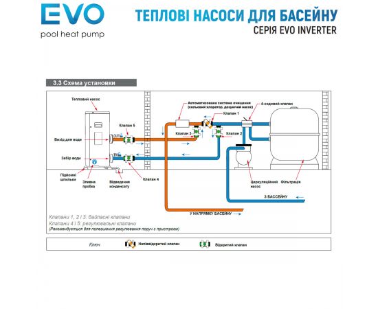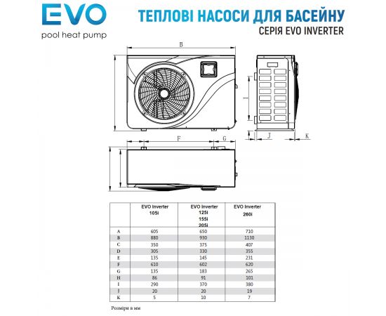 Тепловий насос модель: EVO EP205I потужністю 20,8 кВт використовується як основне обладнання, що встановлюється в басейни приватного або комерційного призначення об'ємом 70-95 м³ для нагрівання та охолодження води. Тепловий насос обладнаний компресором інверторного типу Mitsubishi, має спіралеподібний нагрівальний елемент з титану, завдяки чому пристрій може встановлюватись у басейни із солоною або морською водою. Управління пристроєм здійснюється за допомогою системи контролю Touch&Go+ Wi-Fi та вбудованого в корпус блоку управління з цифровим дисплеєм. Тип холодоагенту – R32 (екологічно чиста робоча речовина). Напруга живлення – 220 ~ 240 В/50 Гц/1 фаза. Об'єм потоку води – 6,7 м³/год. Потужність - 3,04 ~ 0,366 кВт. Потужність охолодження – 10,05 квт. Ознайомитись з іншими видами та типами теплових насосів, які встановлюються у приватні та громадські плавальні басейни.