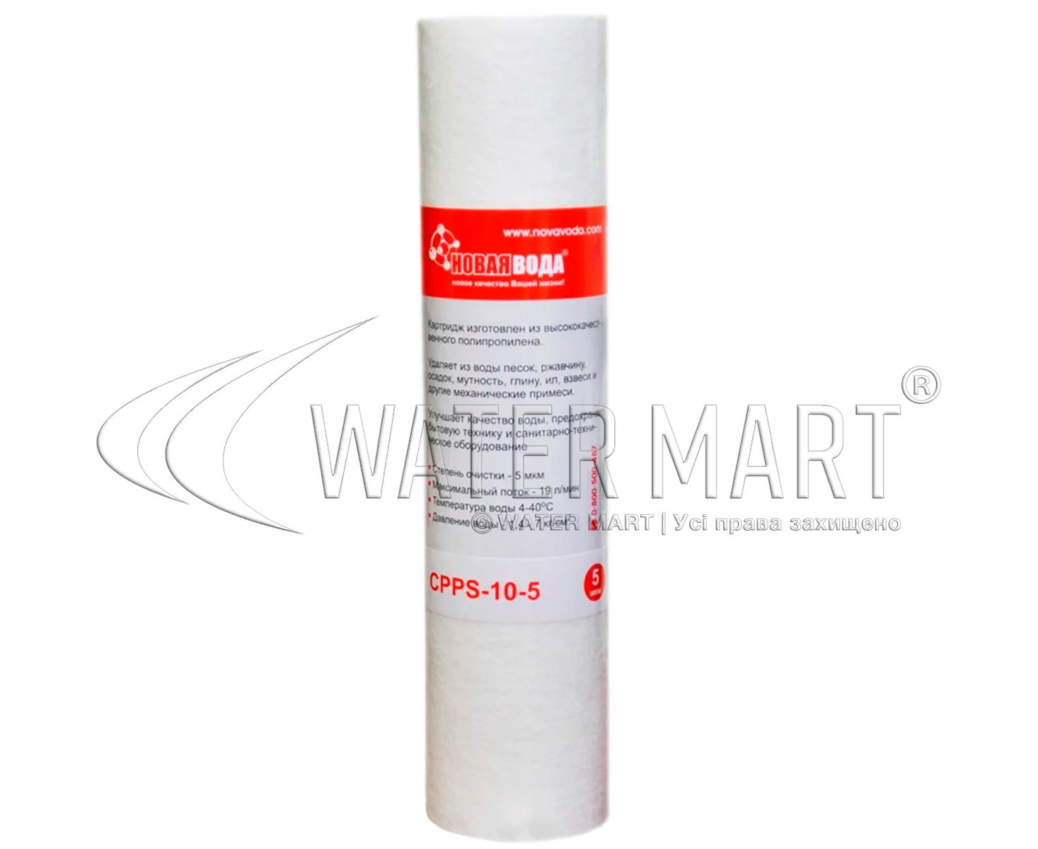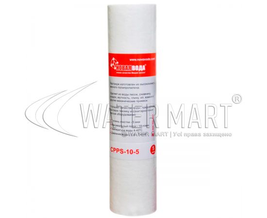 Механічний картридж із пористого пресованого поліпропіленового волокна Нова Вода CPPS-10-5 – змінний фільтруючий елемент із рейтингом фільтрації 5 мкм та номінальним експлуатаційним ресурсом 50 тис. літрів (6 місяців), що застосовується у проточних пристроях фільтрації побутових та промислових систем водопостачання. Застосовується для передфільтрації та грубого механічного очищення холодної питної води від піску, мулу, глини, інших нерозчинних домішок та зависей, а також для захисту водопроводу та сантехнічних вузлів від іржі та пошкоджень. Діапазон робочої температури від +4 до +40 °C. Розмір: 2,5 "х 10".