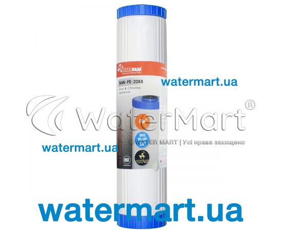 NW-FE-20BB 4,5" x 20" – змінний вугільний фільтруючий картридж розміром 4,5" x 20" / стандарту BigBlue 20" з внутрішньою поліпропіленовою вставкою (додатково сприяє утриманню механічних частинок забруднень та домішок). Як фільтруючий компонент (засипка) використовується високоякісне активоване вугілля Centaur «Anti-Iron» (США) з каталітичними властивостями.