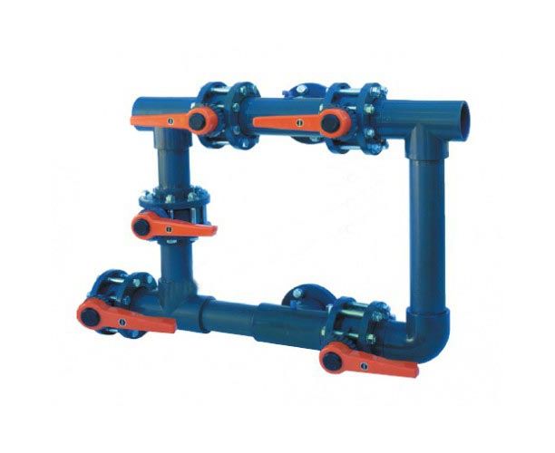 Клапанні батареї для фільтрів із шаруватого пластику серії BRASIL включають: 5 кульових кранів (тільки діаметр 75 мм) або крани-метелика (решта діаметрів), прикріплені до труби (РN6), та ПВХ-фланці (PN16), гвинти (DIN 934) та гайки із оцинкованої сталі, прокладки.