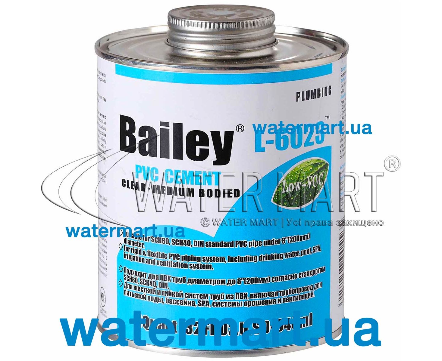 NSF Glue for PVC Pipe SCH40 DIN standard L-6023 118 ml – рідкий прозорий клейовий розчин середньої в'язкості (700-1000 сП) L-6023 для ПВХ-труб стандарту SCH40/DIN максимальним діаметром 200 мм. Підходить для побутових та загальнопромислових гнучких та жорстких трубопровідних систем PVC-U, PVC-M, PVC-O, включаючи трубопровідні системи для питної води, вентиляційні та зрошувальні системи, системи трубопровідної обв'язки плавальних басейнів та СПА. Має тривалий термін служби, низький вміст органічних летких речовин (менше 510 г/л), стійкість до впливу низьких температурних режимів (не втрачає своїх властивостей після розморожування). Поставляється в металевій банці в комплекті з пензликом для нанесення засобу на поверхні, що обробляються. Рекомендується використовувати клей у приміщеннях, що добре провітрюються при рекомендованій температурі використання від +5 до +44 °C.